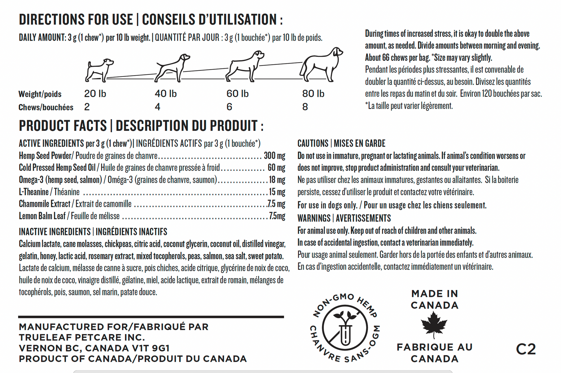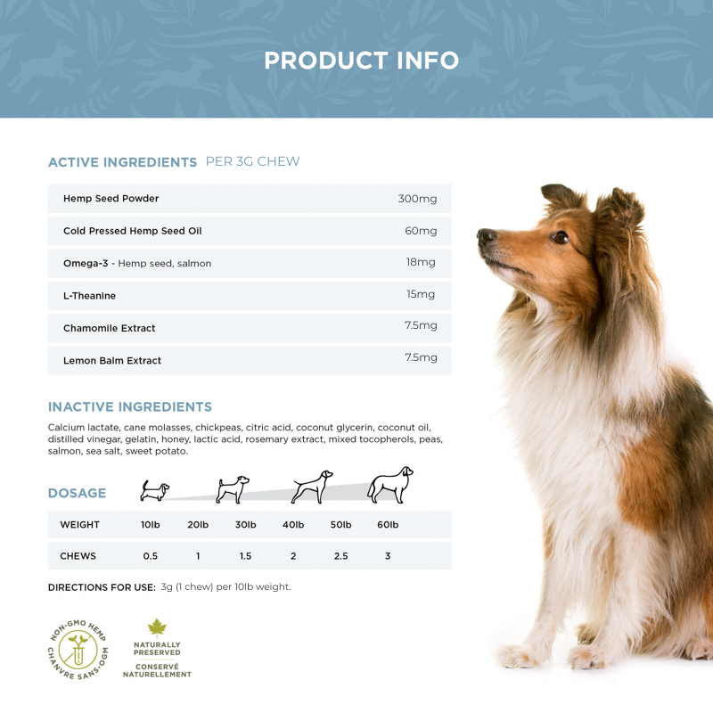 Our veterinary designed, all-natural formulas are made with hand selected active ingredients backed by science. We search the world to bring you and your pet only the highest quality ingredients backed by substantial research. Our formulas contain a hemp seed oil base rich in Omega-3 fatty acids that help support nerve cell maintenance and function. For faster action, we combine Alphawave L-theanine, chamomile and lemon balm that support calm behaviour and relaxation.
