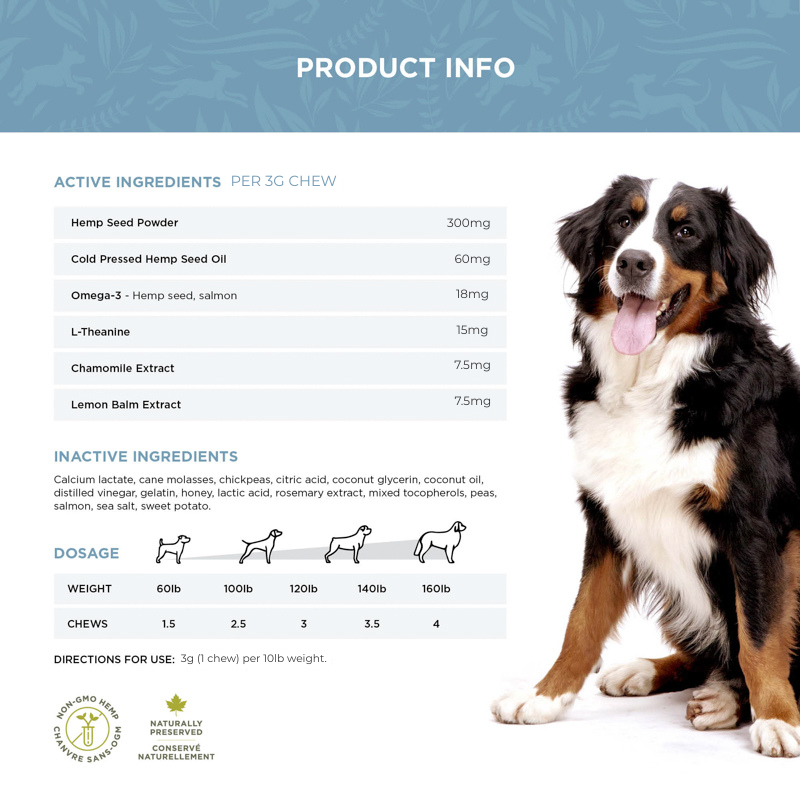 Our veterinary designed, all-natural formulas are made with hand selected active ingredients backed by science. We search the world to bring you and your pet only the highest quality ingredients backed by substantial research. Our formulas contain a hemp seed oil base rich in Omega-3 fatty acids that help support nerve cell maintenance and function. For faster action, we combine Alphawave L-theanine, chamomile and lemon balm that support calm behaviour and relaxation.