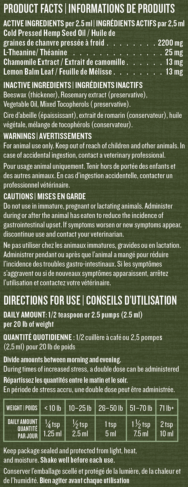 Calming Support Oil: Add to food or kibble once or twice daily; increase temporarily during high-stress days.